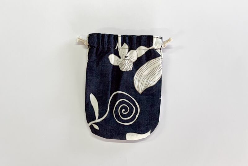 手のひらサイズの巾着は、外側と内側には違う生地を使用したリバーシブル仕立てにしました。